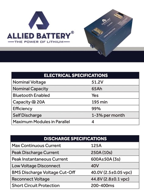 The new, high-tech, high BMS, high-quality 48V 65AH Allied lithium battery outperforms most other lithium batteries as it has high discharge capability: 125AH continuous, 250AH peak, and 600AH peak instantaneous, which is much higher than most other batteries. The 48V 65AH Allied lithium battery is also backed by an 8 year manufacturer’s warranty from the long established, American company.